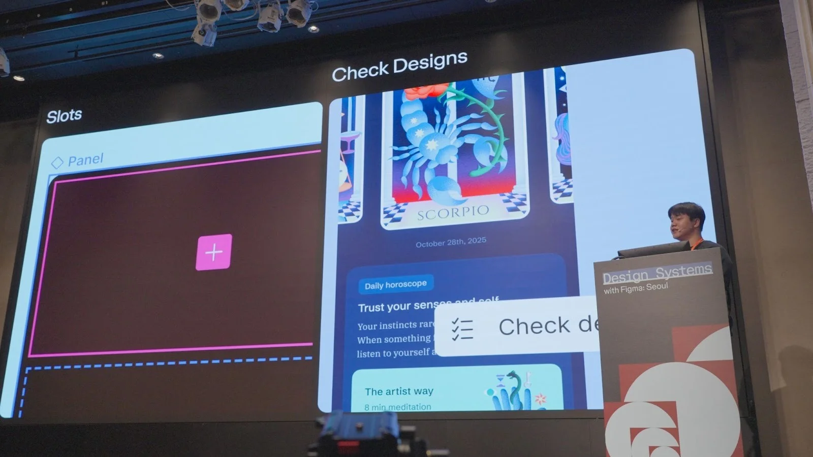 Check Design: 디자인 시스템 준수를 돕는 피그마의 네이티브 솔루션인 '체크 디자인'의 발전 여정을 공유하며, 디자이너의 의도가 실제 구현 과정에서 훼손되지 않도록 그 간극을 줄여나가는 피그마의 비전을 엿볼 수 있었습니다.