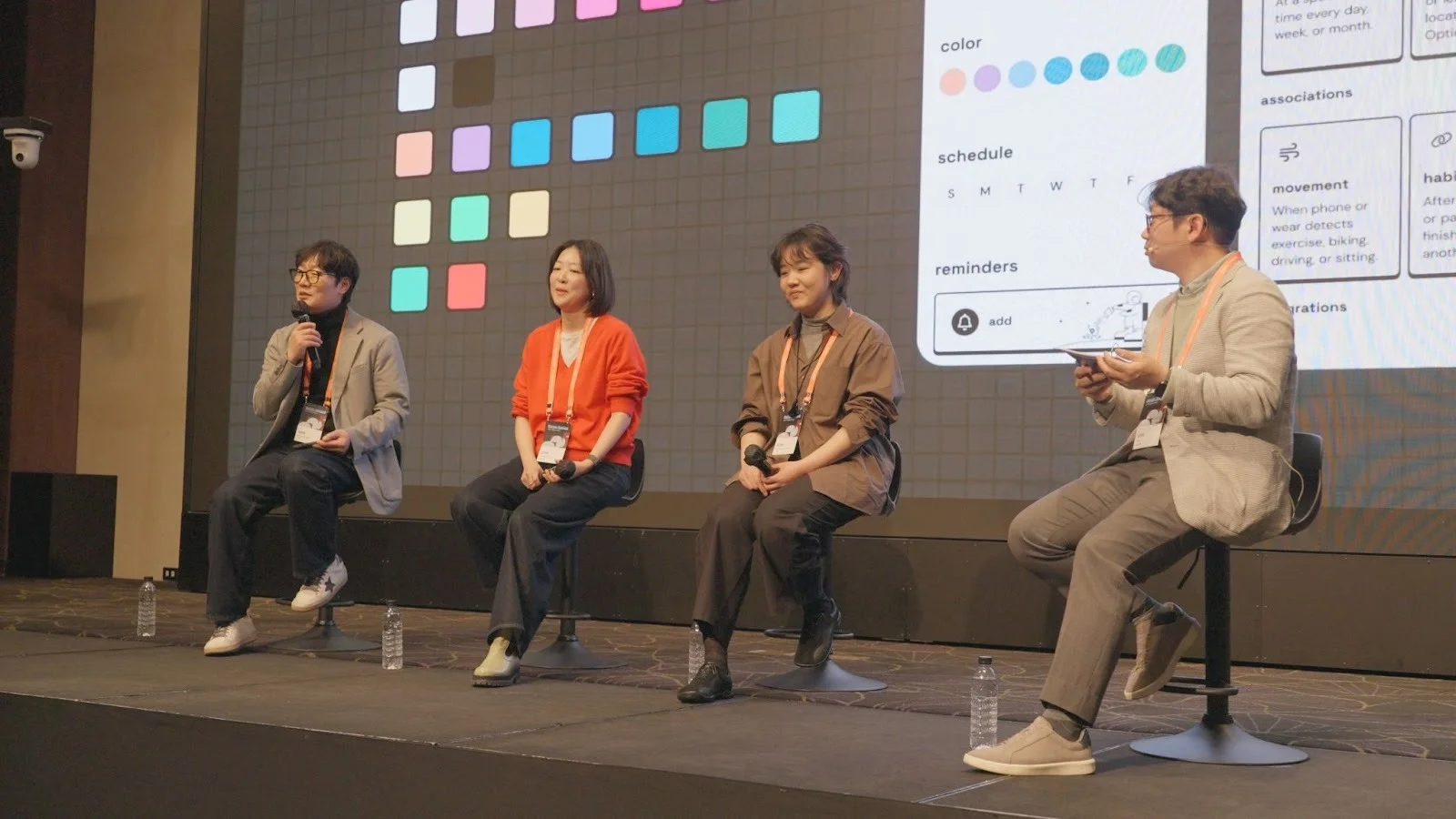마지막 대담 세션에서는 현대자동차 유아란 모바일디자인그룹장님, 듀오톤 송병용 대표님, 여기어때 김지영 플랫폼 디자인 팀장님, 단군소프트 김우성 부사장님이 패널로 참여해 실무자들의 묵은 갈증을 해소해 주었습니다.