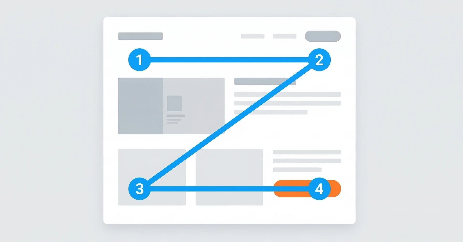 구텐베르크 법칙 (Gutenberg's Law) 사람의 시선은 화면을 Z자 형태로 흐릅니다. 좌상단에서 시작해 우하단에서 멈추는데, 이 마지막 지점인 우측 하단이 사용자의 행동을 가장 강하게 유도하는 영역입니다.